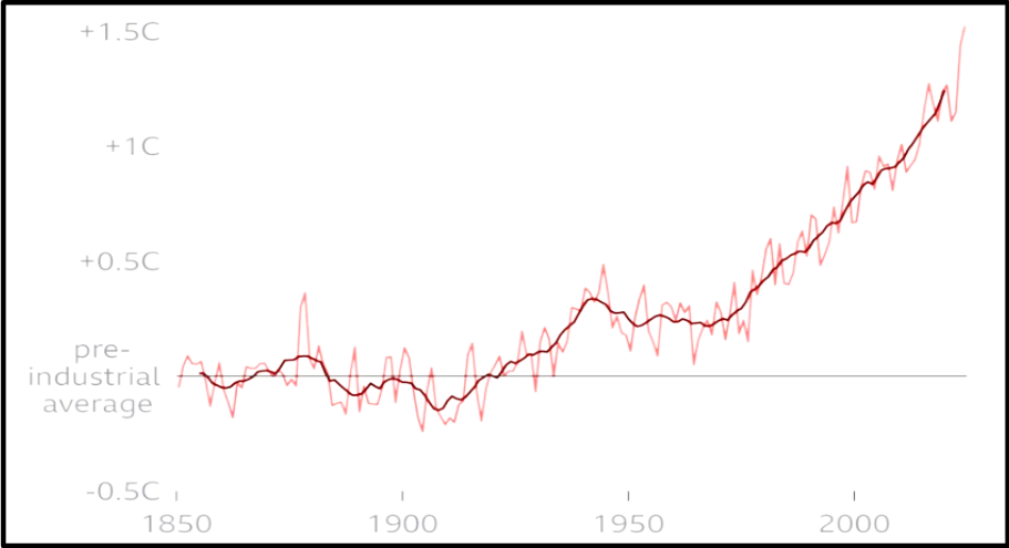 Figura 1Medie annuali (linea rossa) e decennali (linea nera) della temperatura sulla superficie terreste espresse come variazioni rispetto alla media del periodo 1850–1900.
